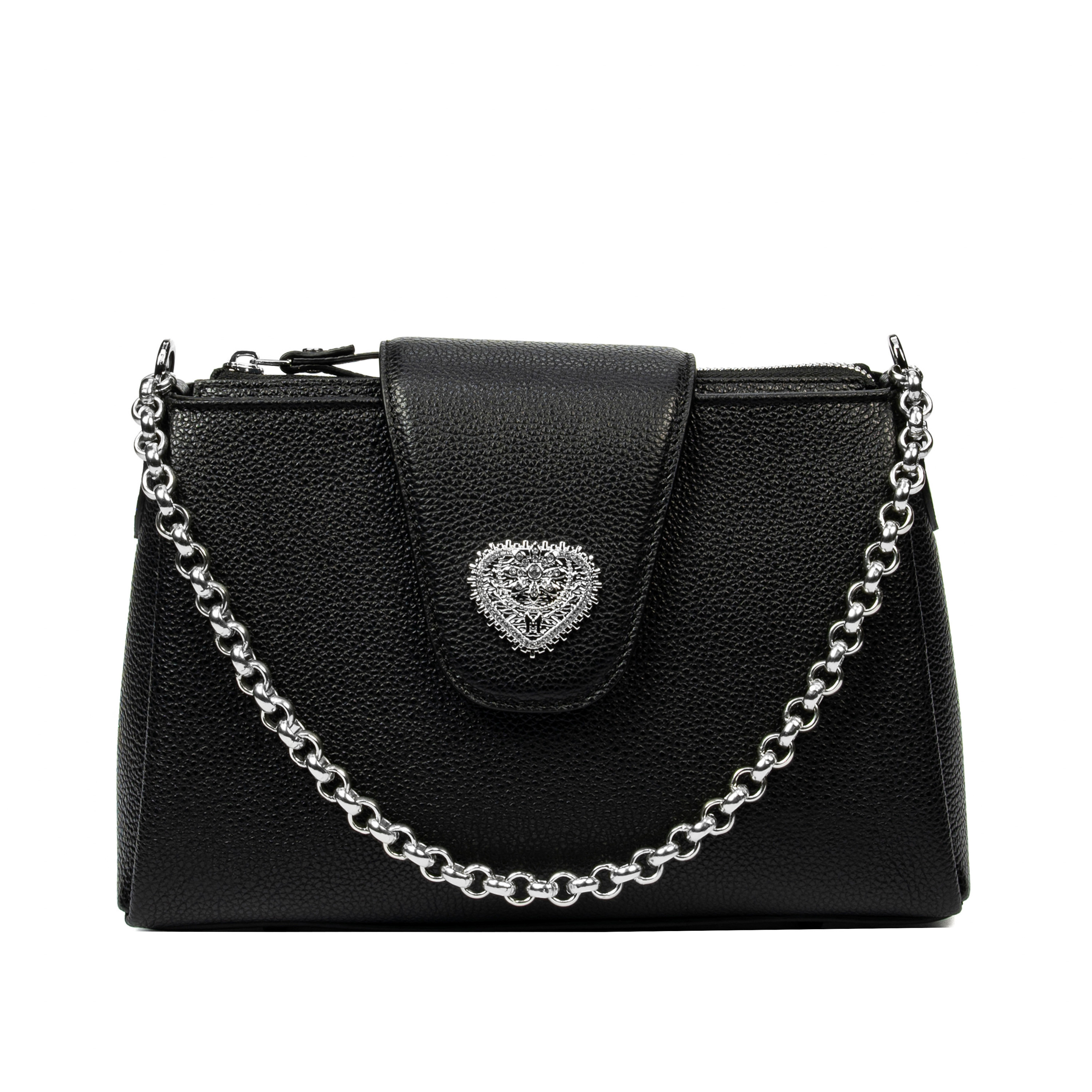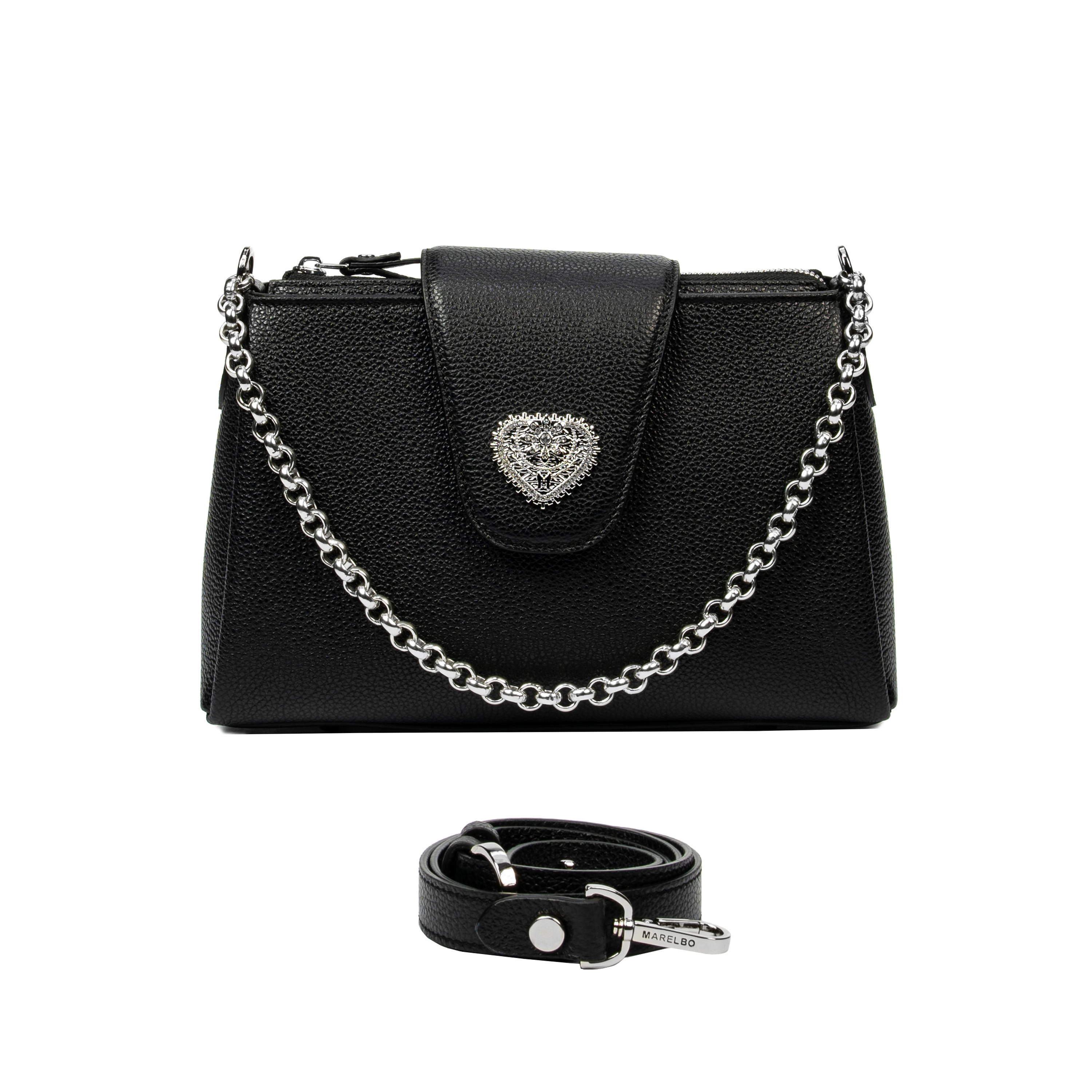 Тази дамска чанта за рамо от естествена кожа на марката Marelbo се отличава с приятния си външен вид и качеството на използваните материали. Естествената кожа има приятна текстура на допир, което й придава особен чар. Тя е подходяща чанта за ежедневна употреба и за различни ситуации. Златната метална верига и декоративният елемент във формата на сърце привличат вниманието с внимателно изработените си детайли. Закопчаването е сигурно, така че личните вещи са в безопасност по време на носене. Металните елементи са издръжливи и запазват външния си вид във времето. Поръчайте сега!