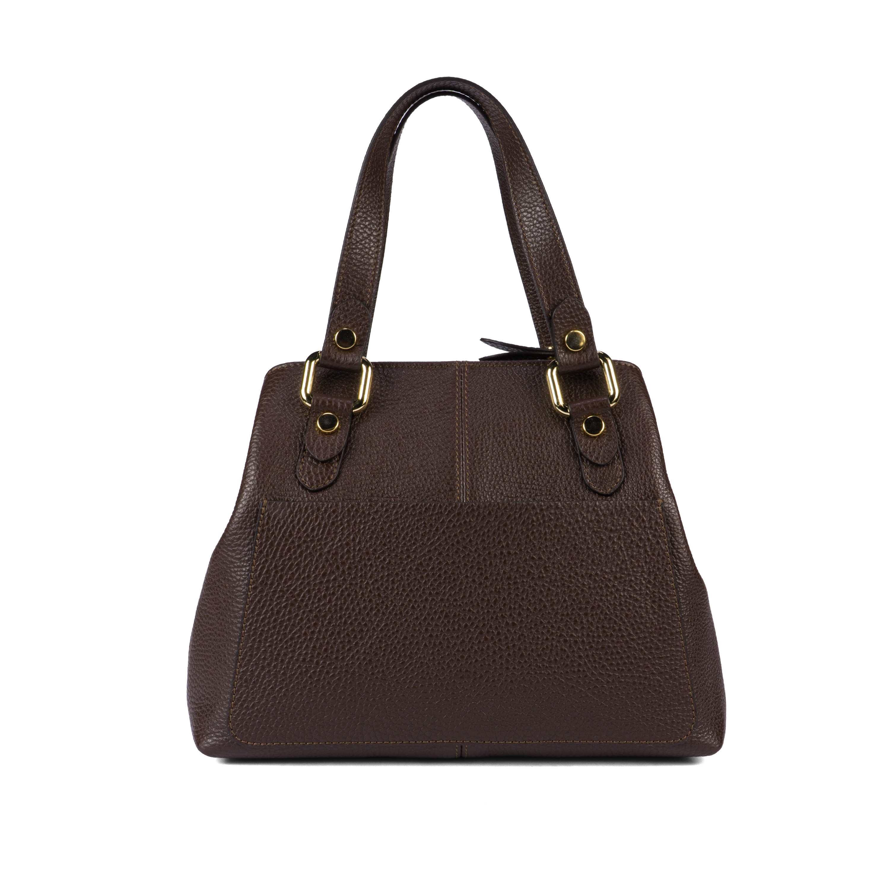 Дамска чанта от естествена кожа тъмно шоколад с модерен дизайн и щедър размер. Интериорът е добре разпределен, така че всяко важно нещо за вас да намери своето перфектно място в чантата. Екстериорът е също добре обмислен, предназначен да изглежда добре, но и да бъде практичен. Поръчайте сега на производствена цена!