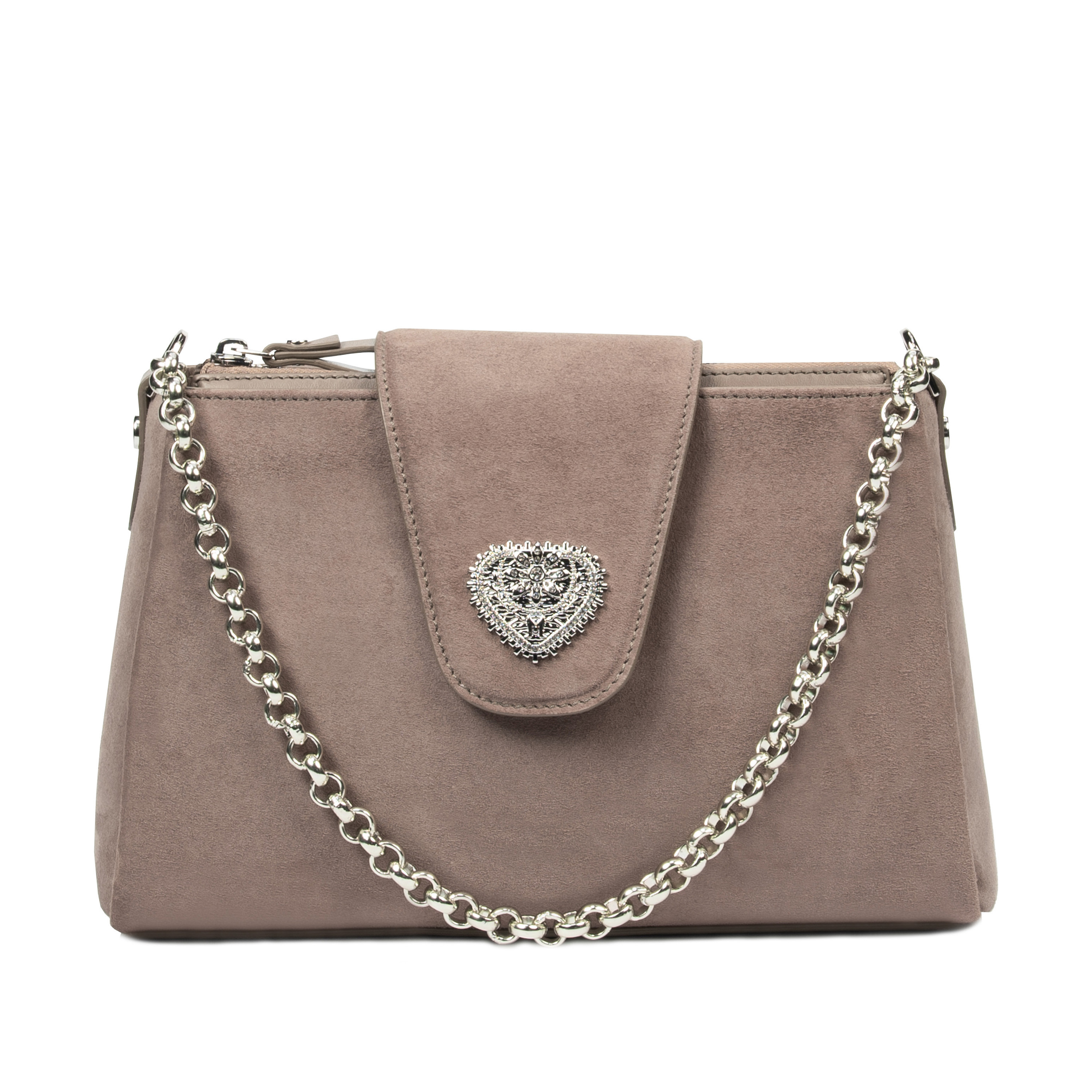 Тази дамска чанта за рамо от естествена кожа, марка Marelbo, се отличава със своя приятен вид и качеството на използваните материали. Естествената кожа има изключително приятна структура на допир, което й придава особено присъствие. Това е чанта, подходяща за ежедневна употреба и за различни контексти. Сребърната метална верижка и декоративният елемент във формата на сърце привличат внимание със своите грижливо направени детайли. Закопчаването е сигурно, така че личните предмети са в безопасност по време на носене. Металните елементи са устойчиви и запазват външния си вид с времето. Поръчайте веднага!